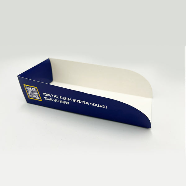Custom printed Hotdog trays - standard size Personalised with your logo, branding or marketing material. Perfect for serving hot dogs, chilli dogs, corn dogs and much more. Custom hot dog trays are made from sturdy 390mic (240gsm) Folding Box Board which is widely recycled. Delivered flat pack, so take up minimal storage space. Easy to make up and serve your delicious food on. Printed in 4 colour CMYK, standard delivery in only 7 - 10 working days from artwork sign off. We also offer express delivery option in: 24 Hours / 48 Hours. Please note: cut off time for artwork in 12pm. Please allow 1 additional day for delivery.